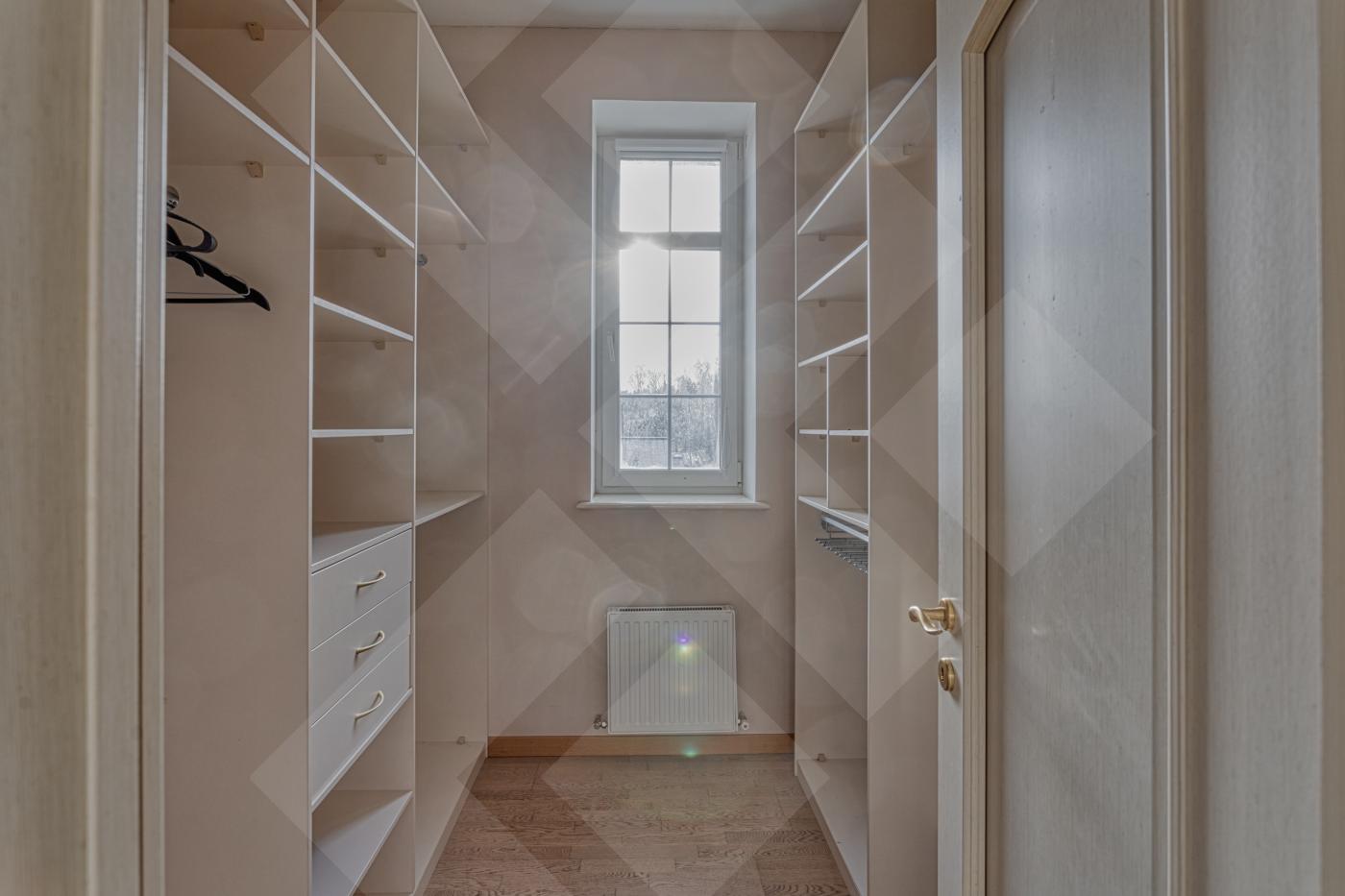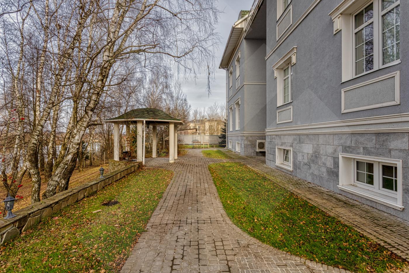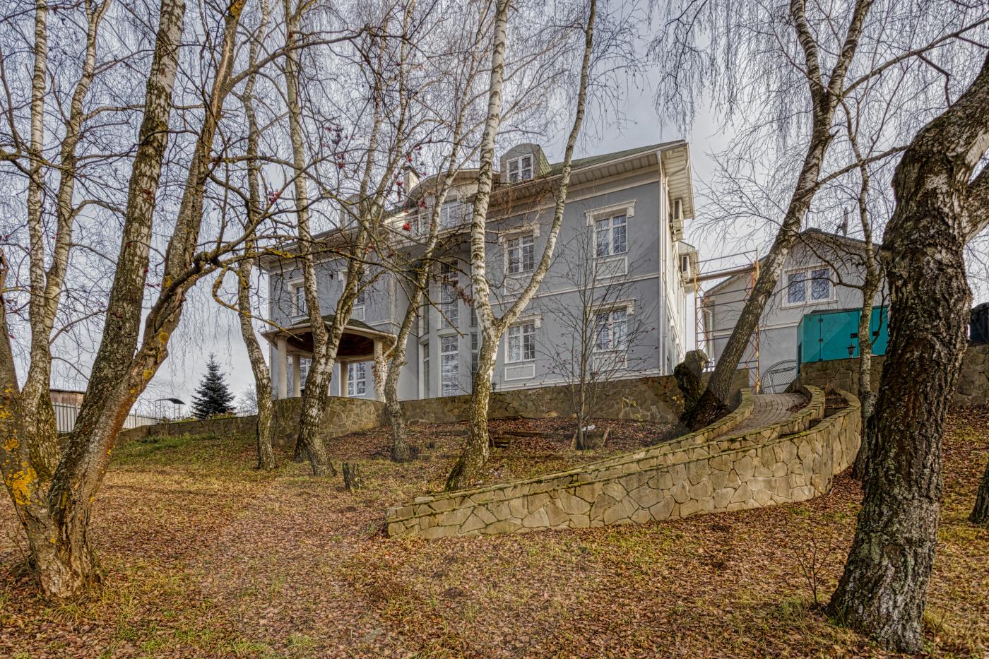 Фасад дома стилизован архитектурными деталями: колоннами, ротондой, усадебным декором, круговыми лестницами. В доме площадью 797 кв. м. 4 этажа и лифт для комфортного перемещения между ними. Всего 8 спален - из них 5 с собственной гардеробной и санузлом. Дом располагается на лесном участке с березовой рощей и выходом к реке Лубянка.