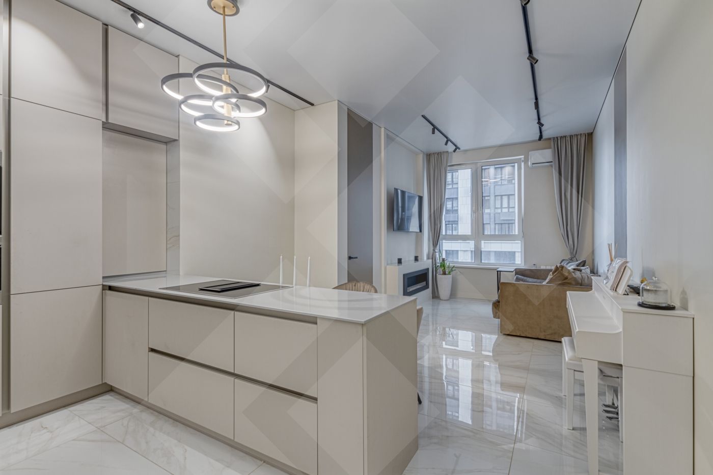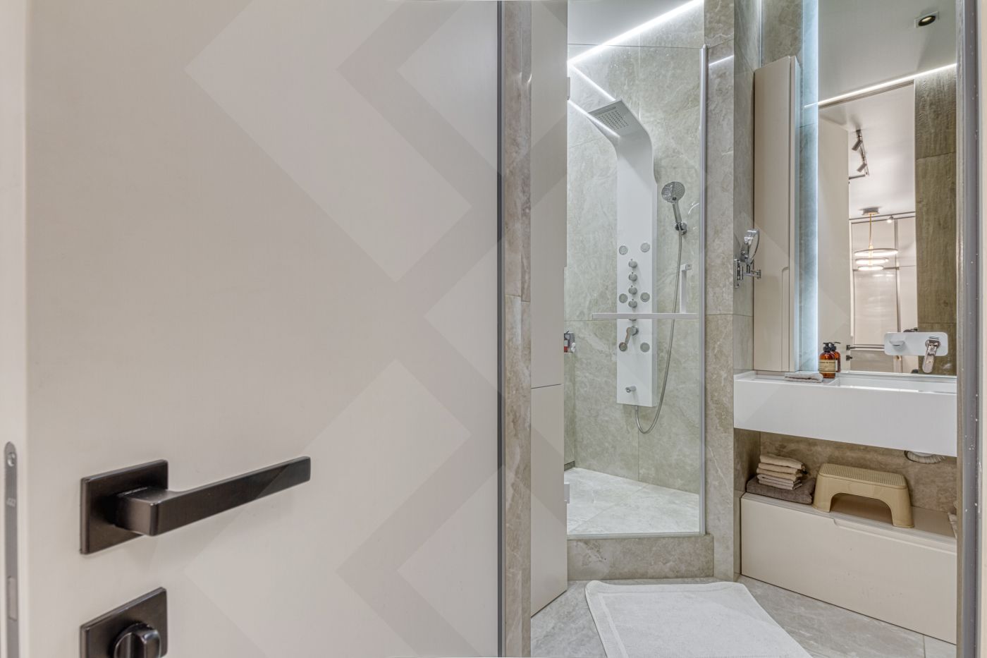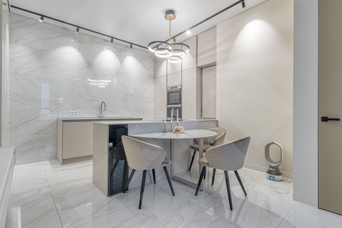 В квартире установлены сенсорные выключатели для многоуровнего света, в кухонной зоне стены выполнены из широкоформатного керамогранита. Вся техника на кухне немецкая. В прихожей, гостиной и кухне полы выполнены из керамогранита, полы с подогревом. Вся мебель в квартире выполнена под заказ, установлены двери увеличенной площади скрытого монтажа. В мастер спальне имеется полноценная оснащенная гардеробная комната. В гостиной установлен кондиционер.