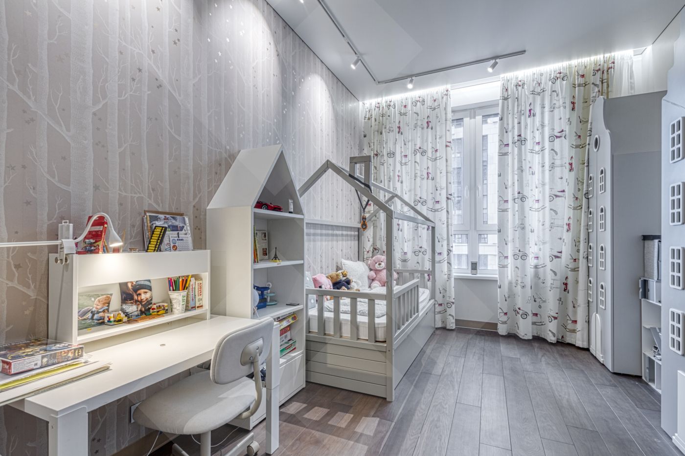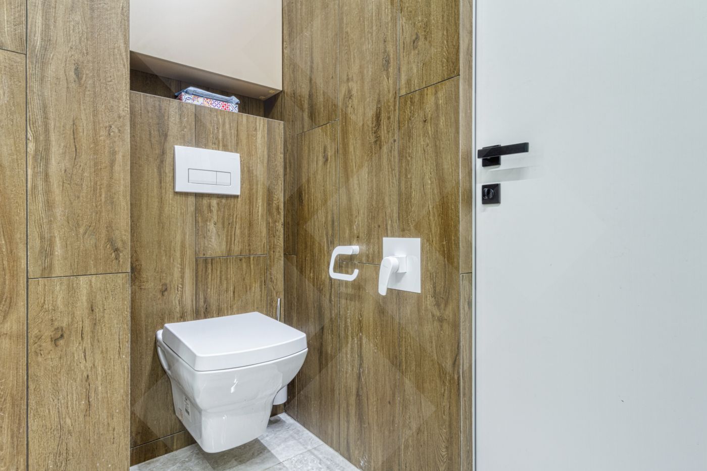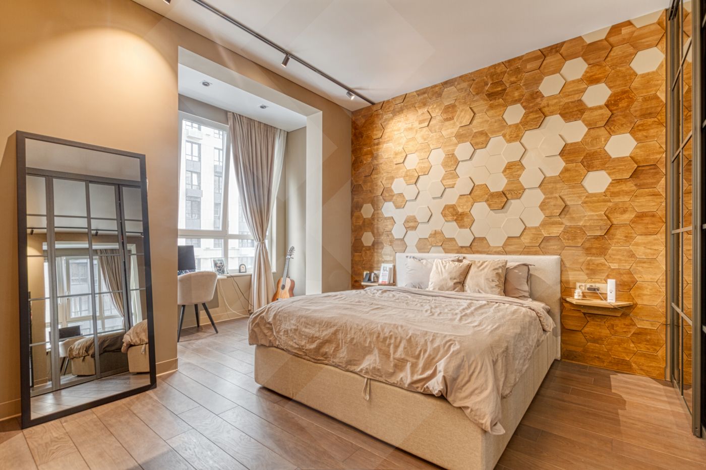 В квартире установлены сенсорные выключатели для многоуровнего света, в кухонной зоне стены выполнены из широкоформатного керамогранита. Вся техника на кухне немецкая. В прихожей, гостиной и кухне полы выполнены из керамогранита, полы с подогревом. Вся мебель в квартире выполнена под заказ, установлены двери увеличенной площади скрытого монтажа. В мастер спальне имеется полноценная оснащенная гардеробная комната. В гостиной установлен кондиционер.