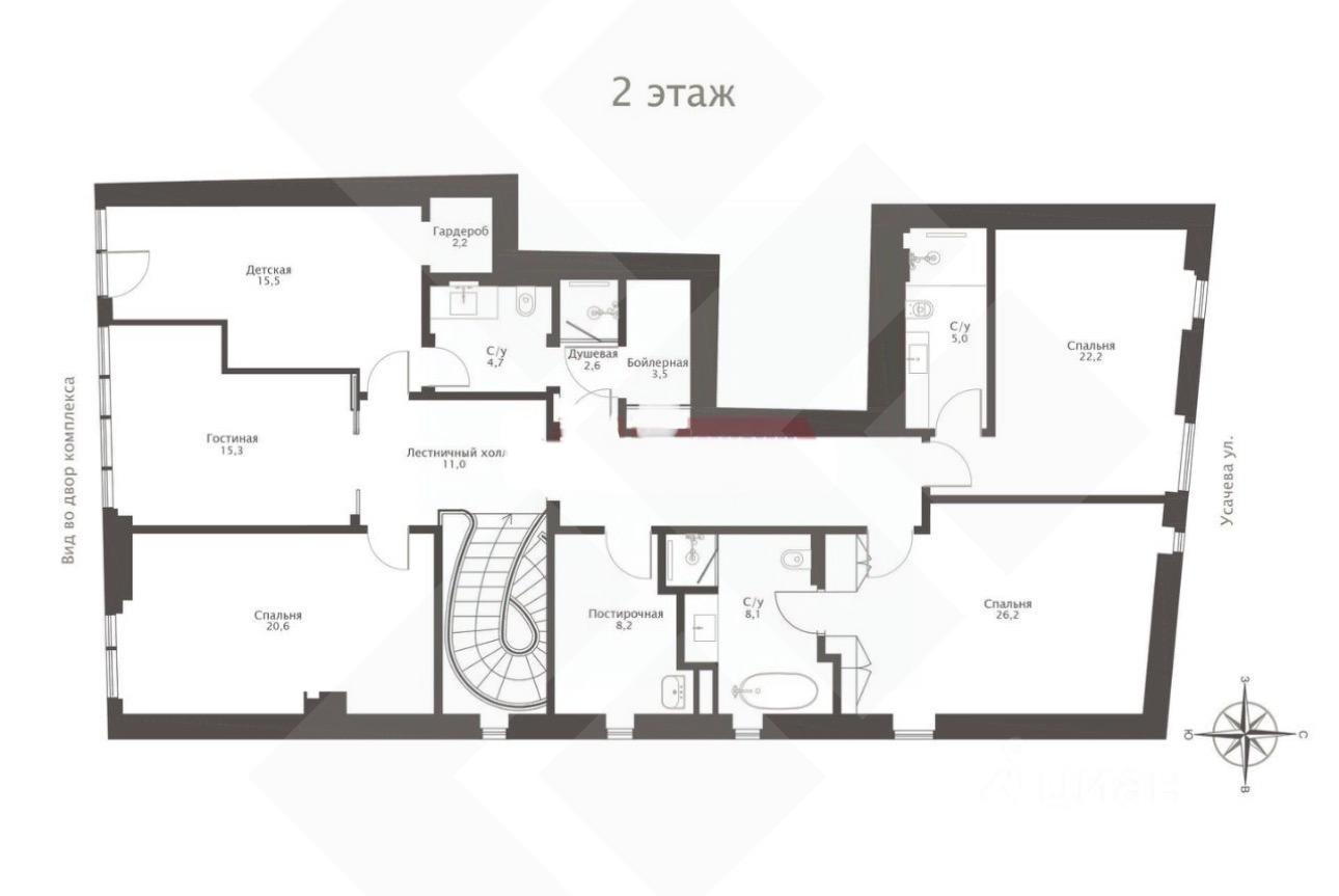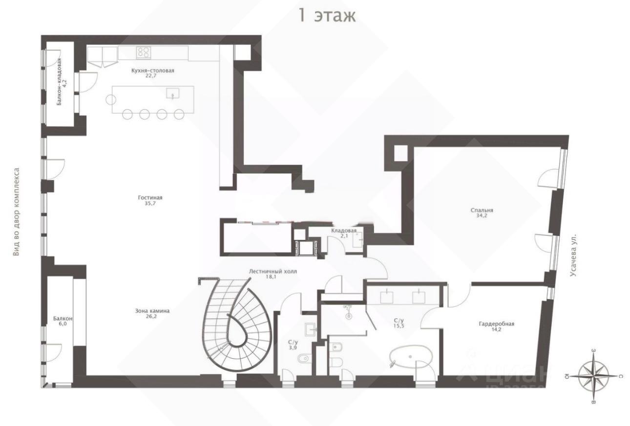 1-й уровень: кухня-гостиная со вторым светом и выходом на балкон, спальня с ванной комнатой и гардеробной, кладовое помещение, гостевой санузел, прихожая. 2-й уровень: гостиная, 3 спальни с собственными санузлами, кабинет или гостевая спальня, постирочная, холл. Пентхаус полностью меблирован и укомплектован премиальной бытовой техникой. Окна ориентированы на 2 стороны света, открываются виды в благоустроенный двор и на улицу.