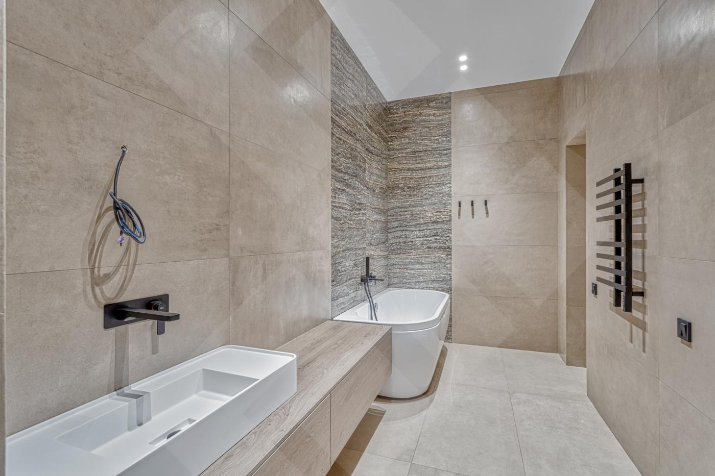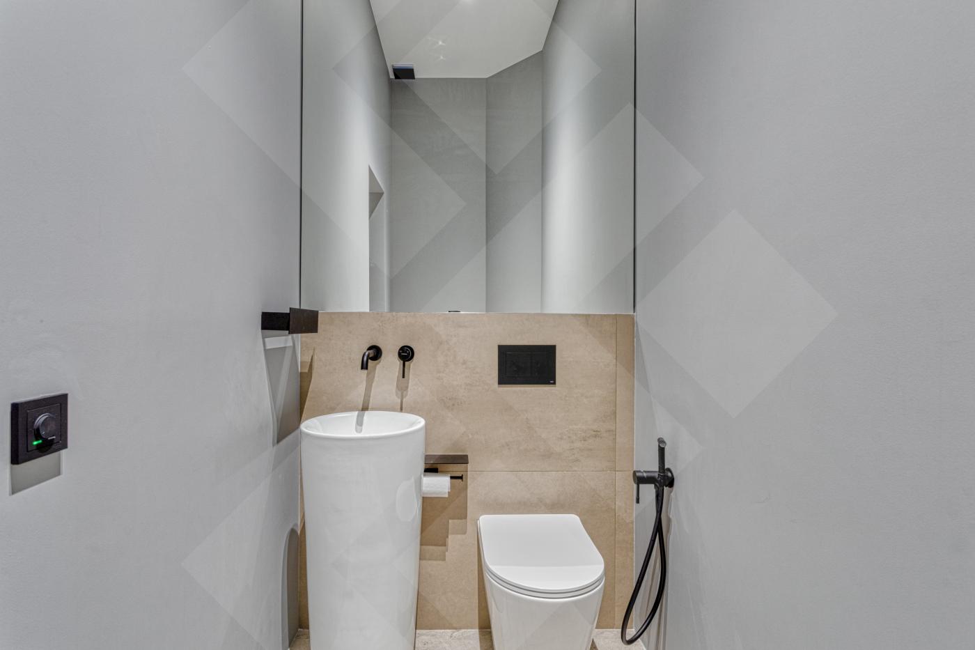 Планировкой предусмотрено: холл, большая гостиная, кухня, спальня/детская, мастер-спальня с гардеробной комнатой, ванная комната с ванной и душевой кабиной, кабинет/третья спальня, гостевой санузел, постирочная, большая гардеробная комната с окнами. Установлена бытовая техника Korting (Германия): духовой шкаф, варочная панель, вытяжка, посудомоечная машина, холодильник, морозильник, стиральная машина, сушильная машина. Сантехника: Boheme, Timo Tome . На полу инженерная доска Finex, керамогранит Italon. Кондиционеры во всех комнатах.