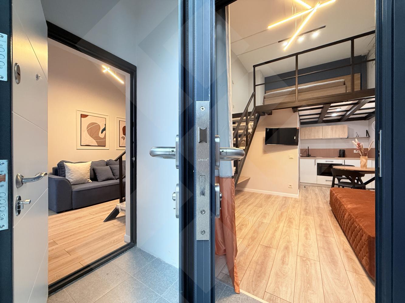Апартамент разделен на 2е полноценные студии, каждая имеет свою кухню - гостиную, оборудованный санузел и спальню зону расположенную на антресольном этаже.