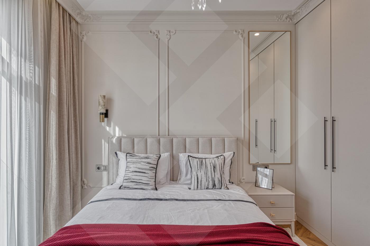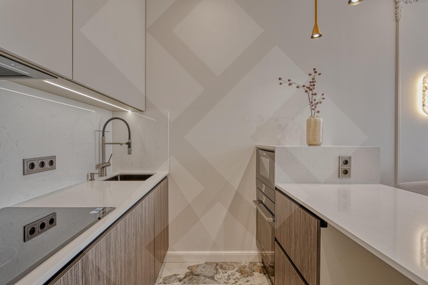 Квартира полностью меблирована и укомплектована бытовой техникой Bosch. Вся мебель выполнена на заказ, кухонные столешницы — из кварцевого агломерата.