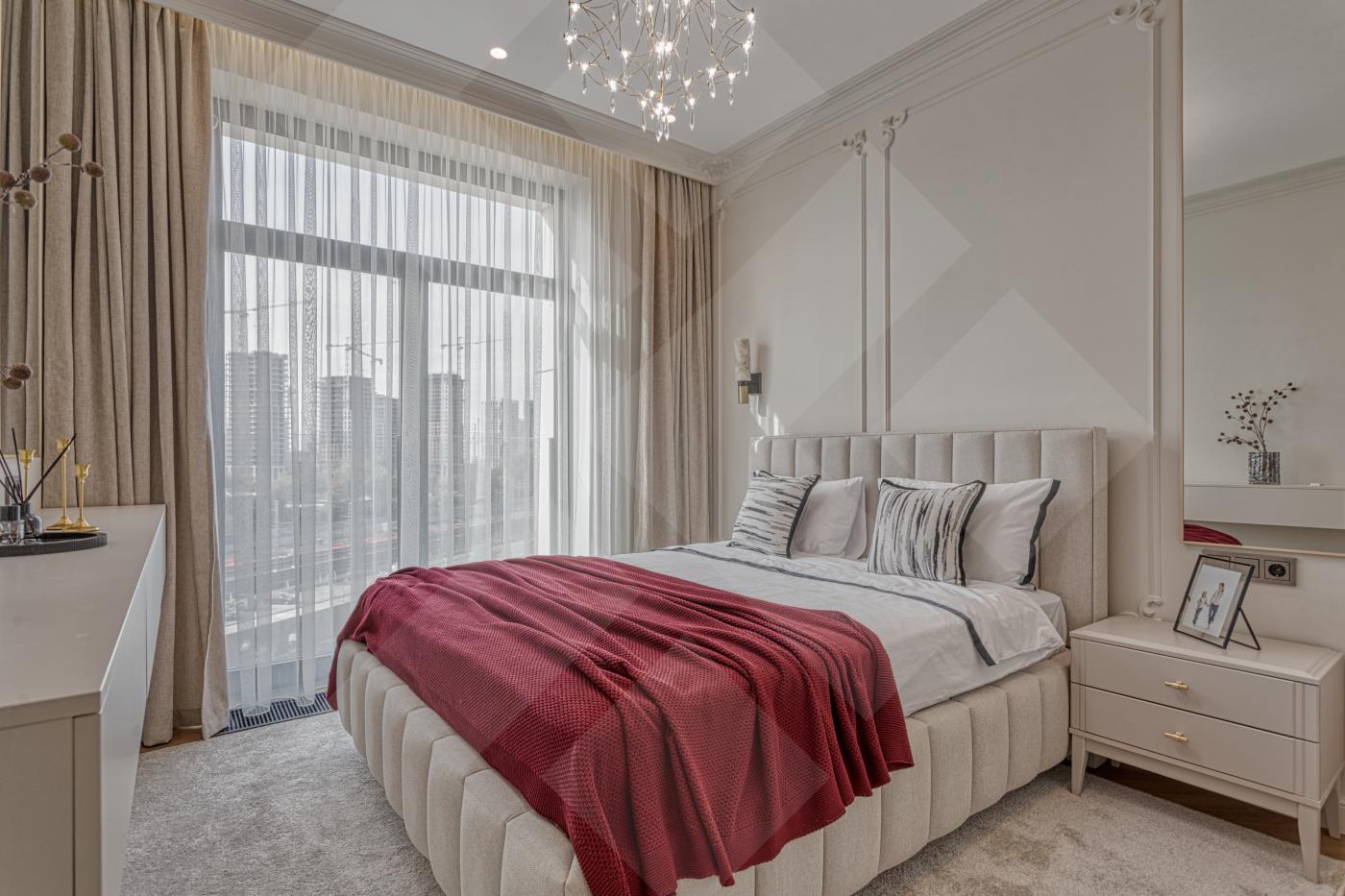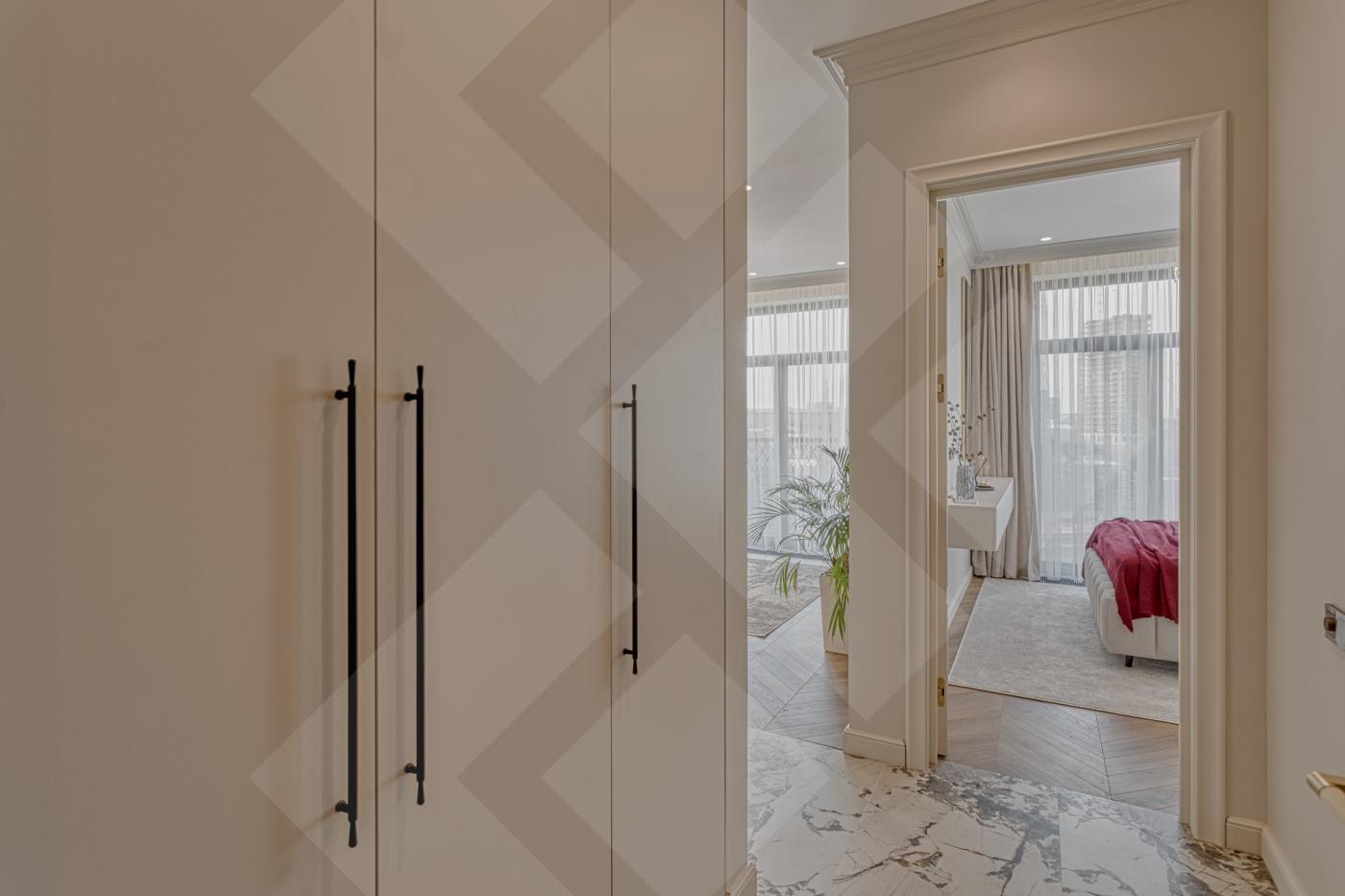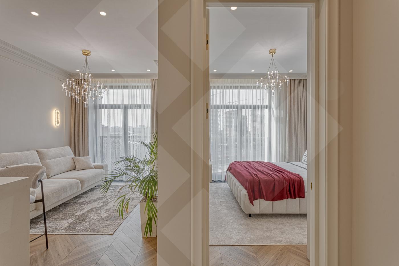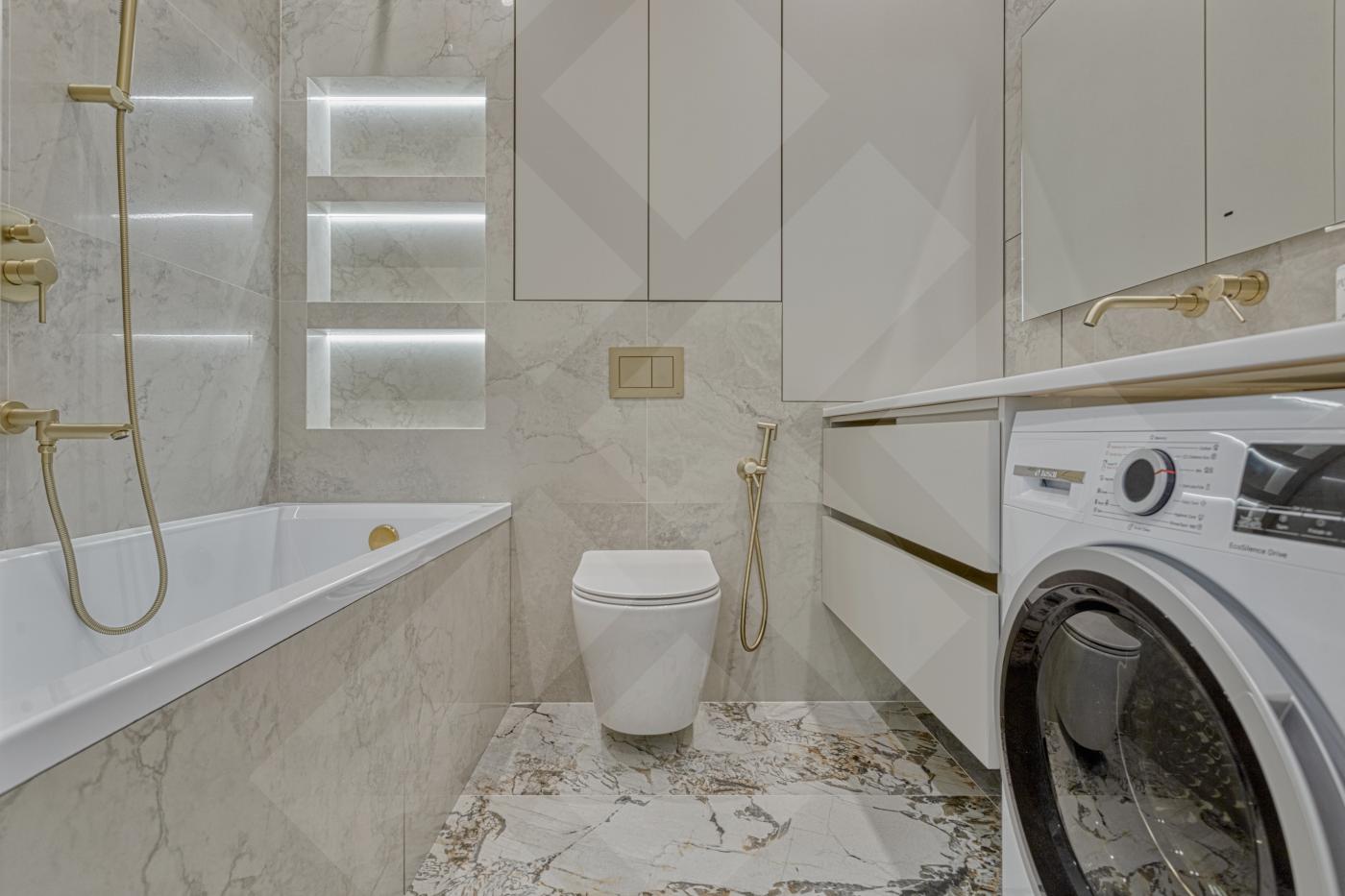 Квартира полностью меблирована и укомплектована бытовой техникой Bosch. Вся мебель выполнена на заказ, кухонные столешницы — из кварцевого агломерата.
