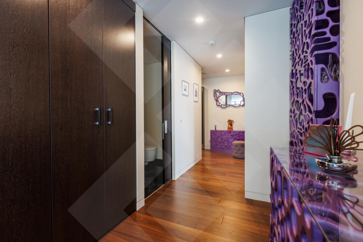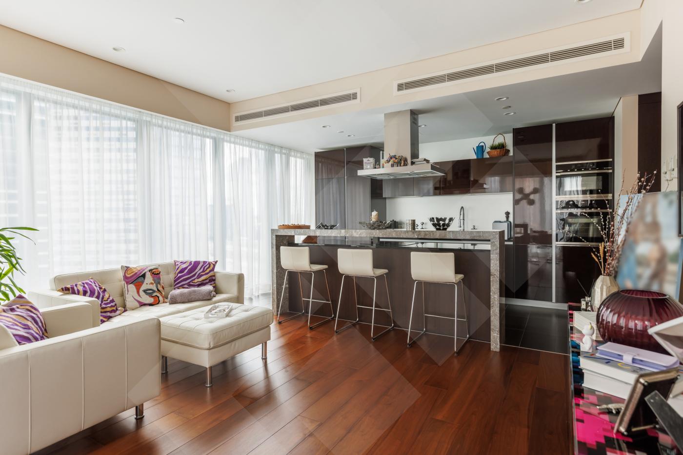 Планировкой пространство выглядит следующим образом: угловая гостиная совмещенная с кухней, мастер-спальня с панорамной ванной комнатой, холл, гостевой с/у, постирочная. Апартамент наполнен премиальной отделкой и мебелью: кухня RIFRA Италия, сантехника FANTINI Италия, бытовая техника KUPPERSBUSCH Германия, окна SCHUCO. Высота потолков 3м. Приточно-вытяжная система вентиляции и центральное кондиционирование для комфорта проживания.