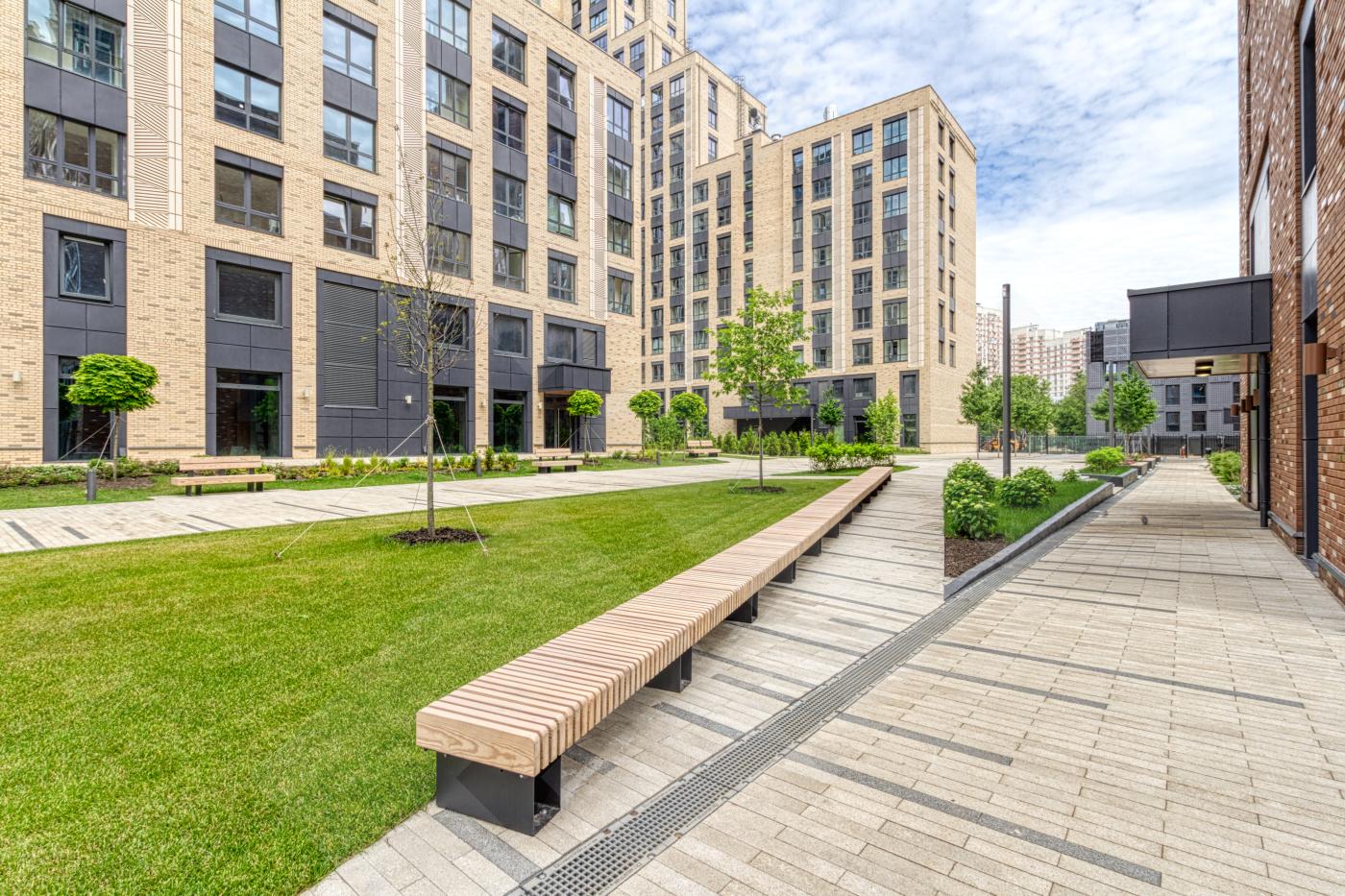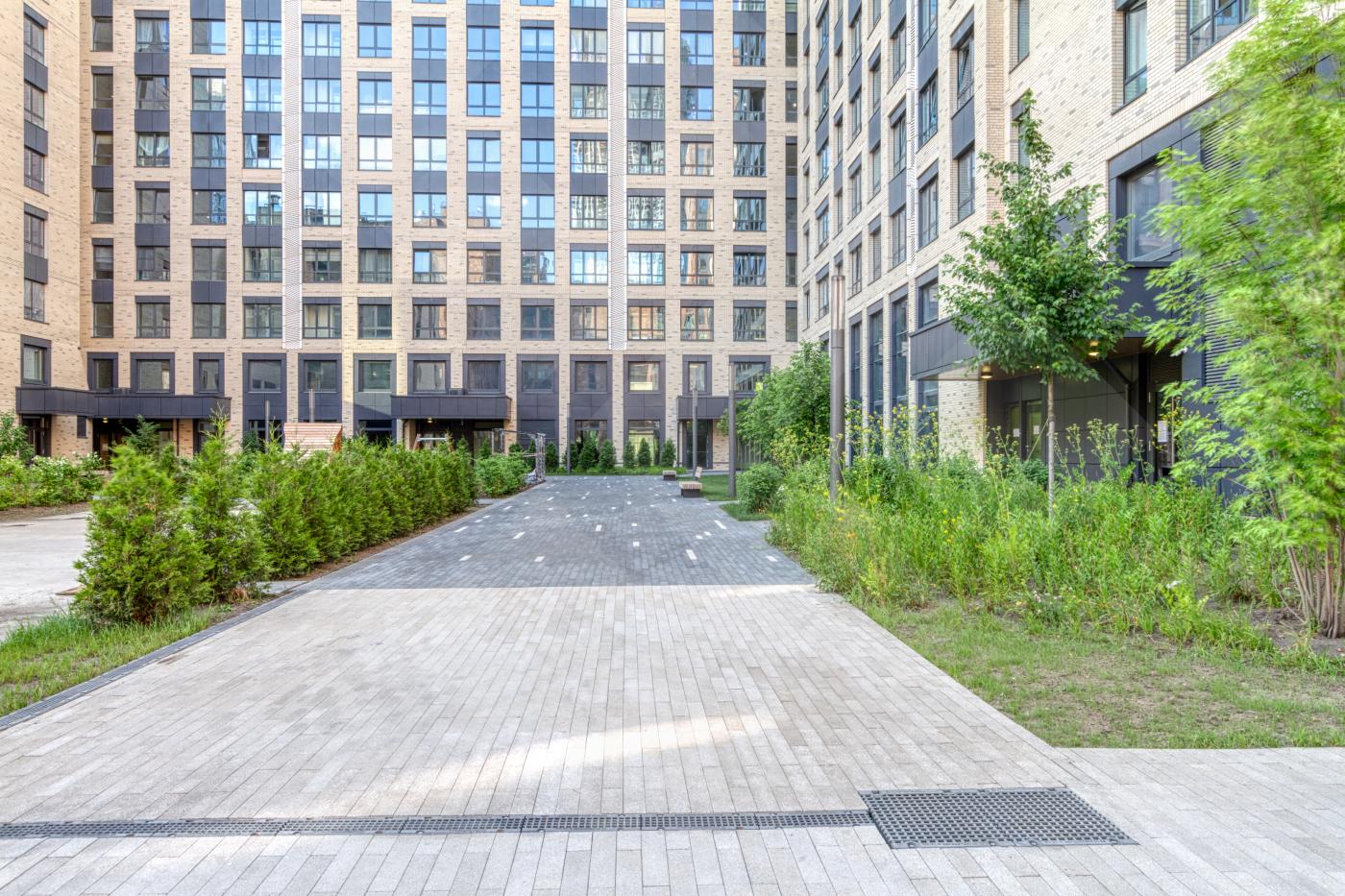 Во внутренних дворах предусмотрены тематические сценарные площадки, на которых дети могут попробовать себя в разных профессиях, а также пешеходные и велосипедные дорожки, спортивные и игровые площадки.