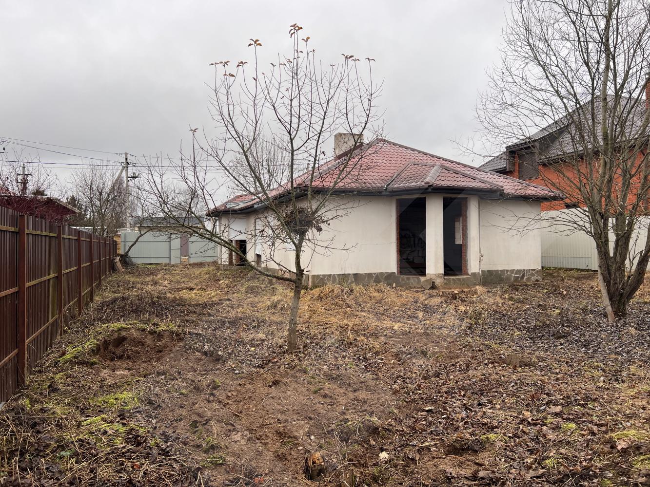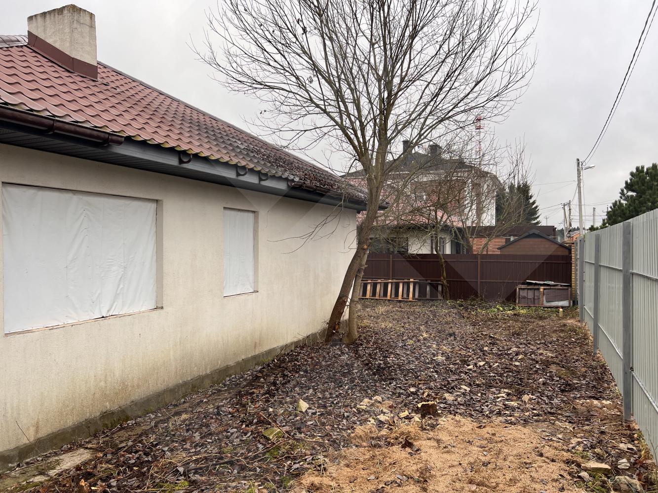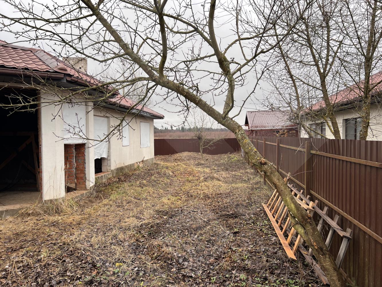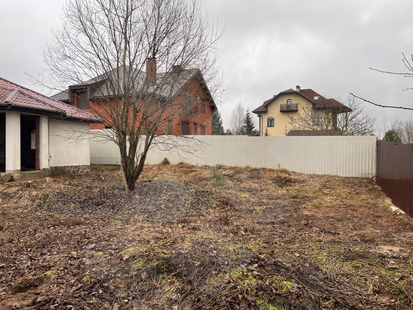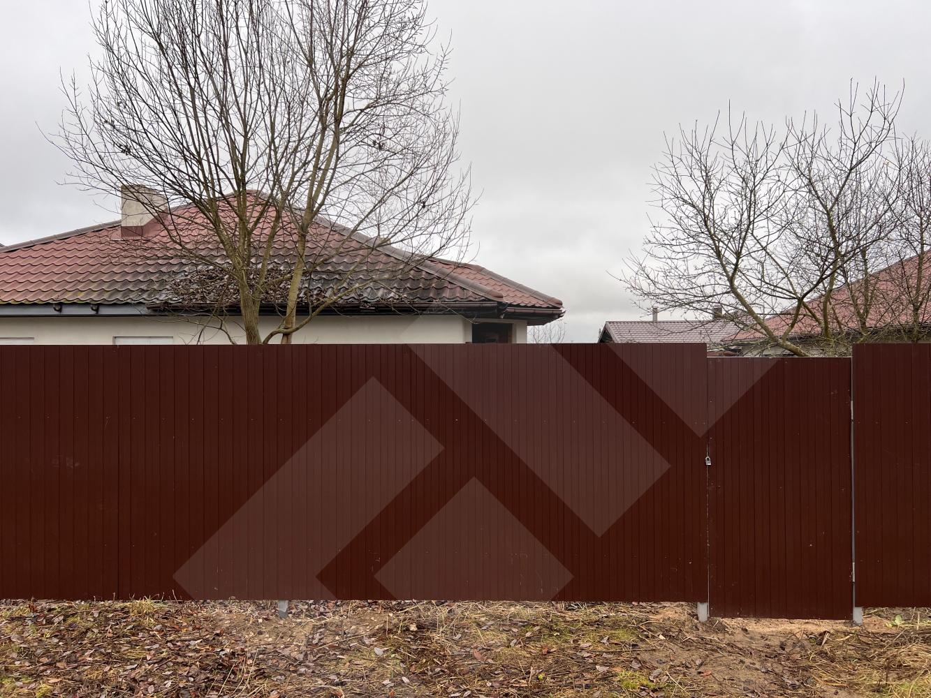 Забор профнастил. Здание на участке материал - газоблоки, крыша черепица.