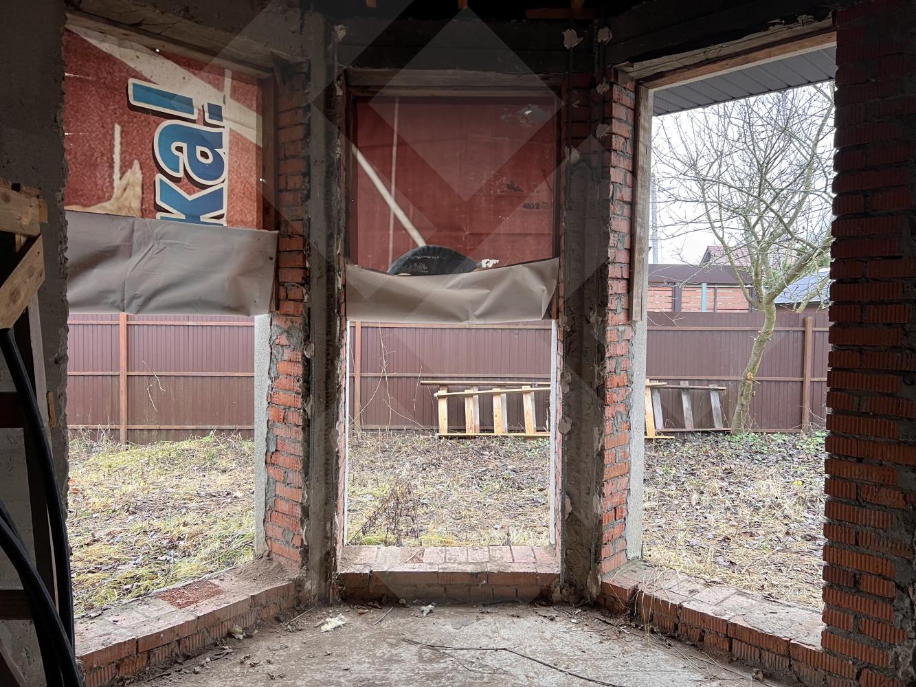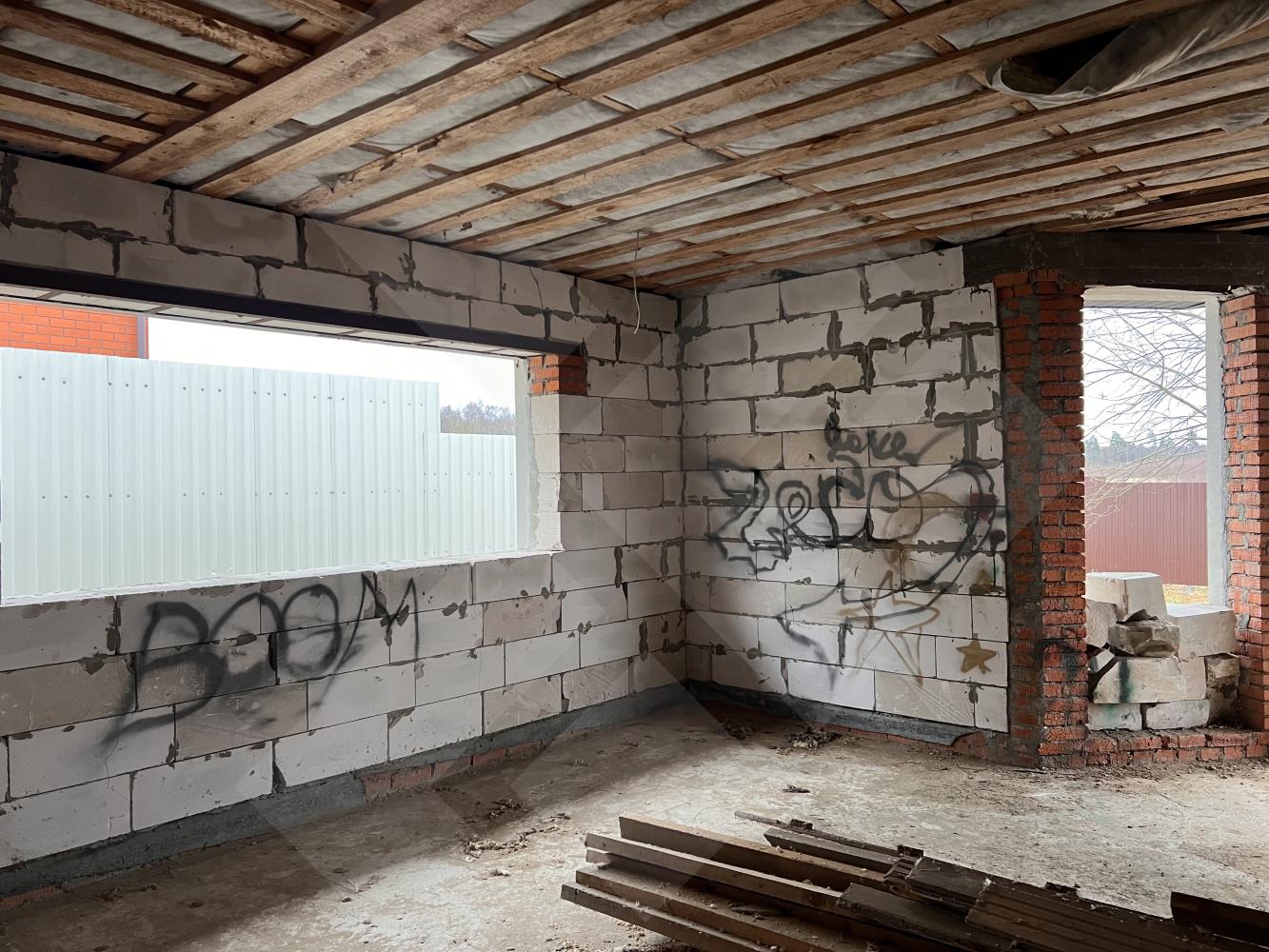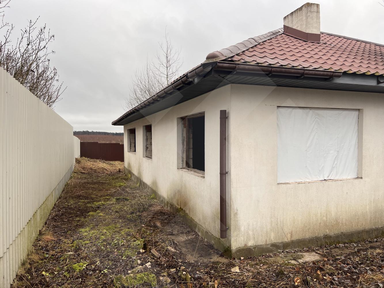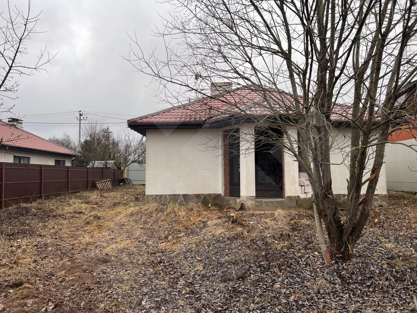 Забор профнастил. Здание на участке материал - газоблоки, крыша черепица.